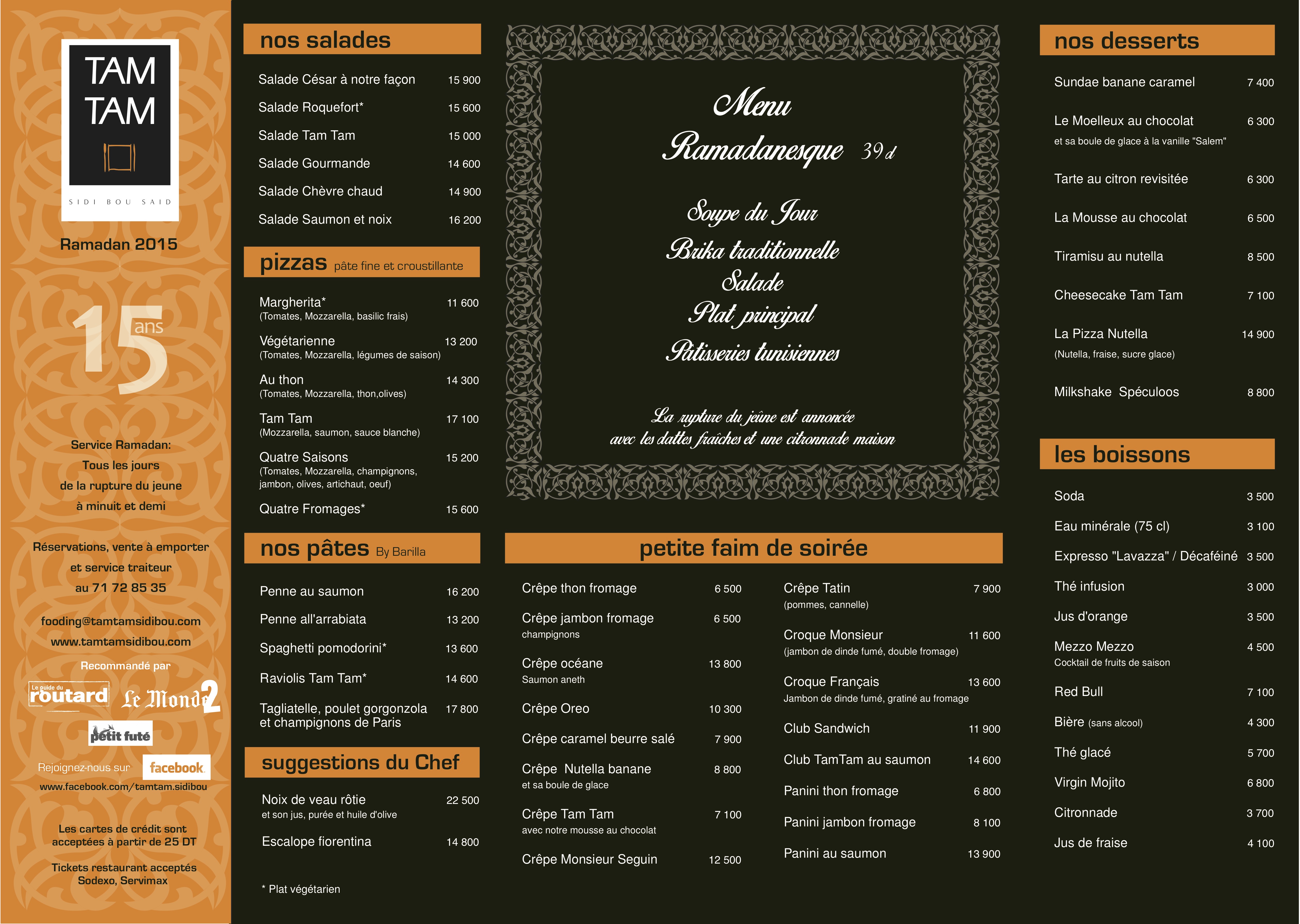 Hier on est retourné comme à chaque année au resto TAM TAM SIDI BOU SAID … service impeccable… propreté… rapidité… et mets succulents. Ils cuisinent 2 menus pour permettre le choix. Dès qu’on s’attable on a devant soi un verre de citron doux à la menthe des dattes fourrées au beurre… ambiance à la chandelle… À l’appel à la prière instantanément on apporte la soupe : hier c’était le choix entre soupe aux légumes et poulet… bnina et soupe aux lentilles… bnina zeda… Puis le thème d’hier c’était la cuisine libanaise. …. donc on nous apporte tous 2 plats : un contenant brik danouni falafel farci à la viande et pignon et petite pizza aux épinards… l’autre contenant deux types de 7ommous et une teboulé … nous avions aimés… Enfin en plat principal on avait le choix entre un couscous à l’agneau. … buonissimo… garni d’un piment vert frit à la tunisienne ou bien un plat brochette viande de veau et viande de poulet intercalés avec piment vert et oignon… plus une part kebab de viande de poulet hachi et mixé aux persil et oignon et épices puis grillé et une part kebab faite de la même façon mais constituée de viande de veau…. accompagné le tout par un riz au curcuma et amandes et raisins (désolée d’avoir oublié de prendre en photo le plat de brochette). En dessert (on n’avait même pas pu terminer nos plats par générosité des quantités) il y avait salade de fruit de saison … ou bien kounefa petit modèle et succulente … ou bien harissa sucrée (dessert populaire tunisien). Un vert de thé vert… 1 litre d’eau en bouteille de verre entre deux personnes… et vue et ambiance de sidi bou said de proximité…. le tout pour 60 dt la personne. Pour garantir une place à la terrasse il faut réserver d’avance. J’avais demandé aux serveurs quand est ce qu’ils dinent eux… ils m’ont répondue à 22h !!!…. Chapeau bas pour tous ceux qui font bien leur boulot.